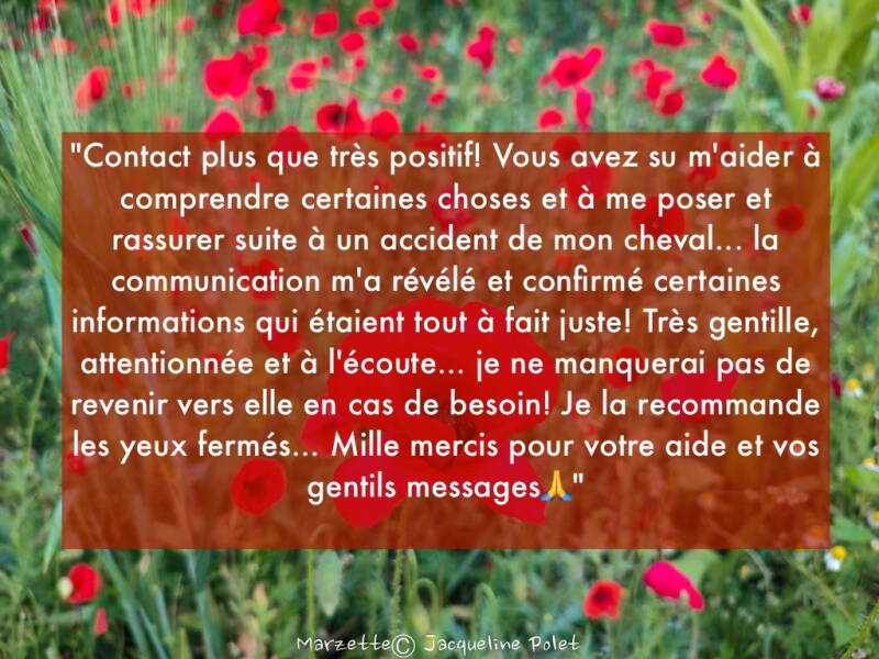 “Jacqueline a été d’une aide précieuse pour traverser ce moment d’immense tristesse qu’à été la perte de mon cheval après 25 ans d’une profonde relation. Prendre la décision de le perdre à été un cheminement compliqué. La savoir à mes côtés pour m’aider à faciliter la communication ensemble à été important. Cela m’a permis d’être apaisée et de me sentir alignée dans cette décision. J’ai pu l’accompagner au mieux et être avec lui jusqu’au bout d’une très belle façon.
