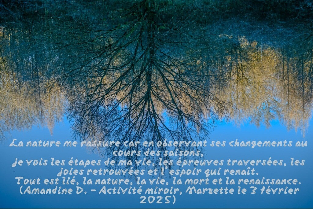 Comme je ne vais pas bien en ce moment, j’ai décidé de participer à une activité de découverte. Vu la météo froide mais très lumineuse du jour, j’ai opté pour l’activité “Miroir”. Et le moins que je puisse dire, c’est que cette activité porte bien son nom! C’est incroyable comme cette balade dans la nature encore engourdie par le froid de l’hiver a été le reflet des émotions qui m’habitent en ce moment. Tant de choses sont apparues claires à mes yeux, exactement comme le reflet des arbres dans l’eau. Jacqueline m’a proposé de photographier ce qui me touchait à travers notre balade et cela m’a permis d’immortaliser cette magnifique matinée. Du fond du coeur, merci! Hâte de découvrir l’activité “Ouvrir la porte de la connaissance de soi”.